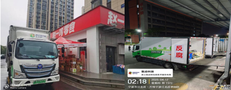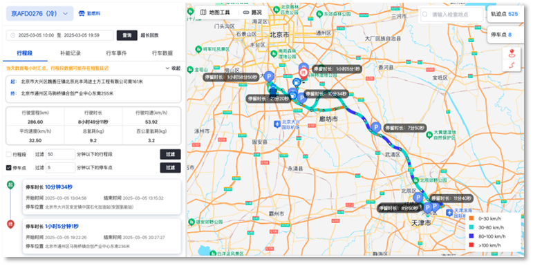 场景描述:本应用场景为环京城际冷链配送场景,服务范围为北京大兴百利威物流园到天津美团小象门店,往返距离300-360公里之间(根据配送门店数量多少而不同)。每日中午、晚上两个班次,每个班次发车3-5台。车辆日均行驶里程350公里左右,单车月行驶公里1万公里左右。主要运输货物为民生物资。
