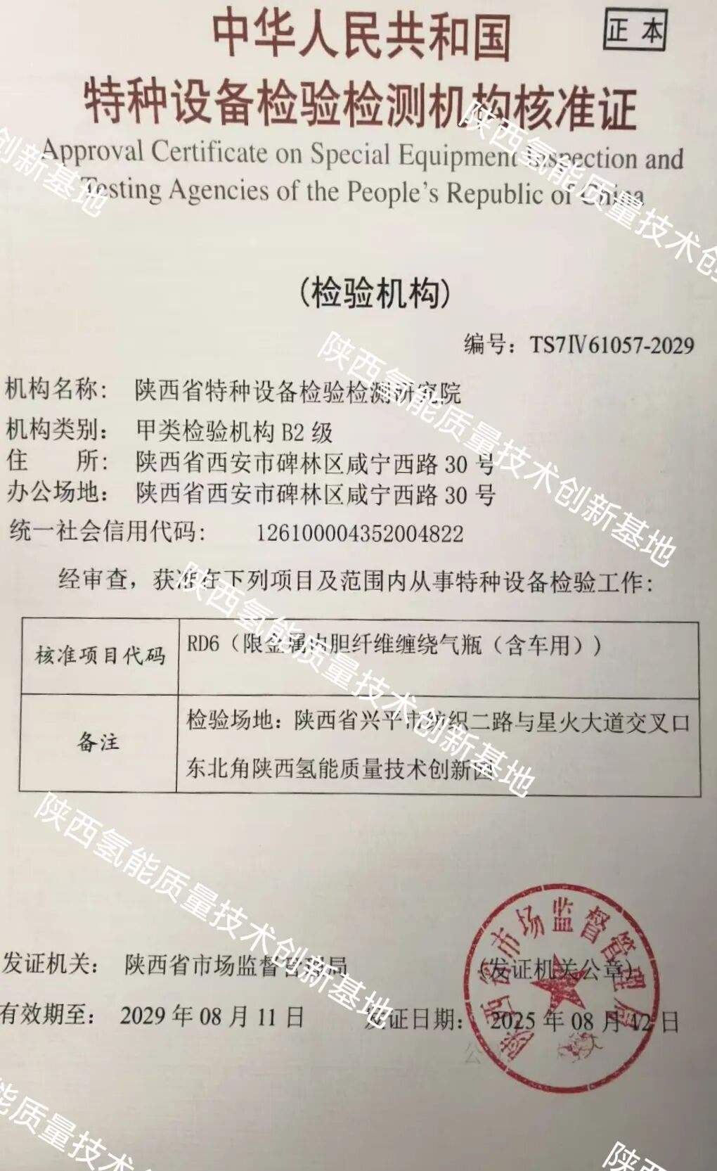 陕西省特种设备检验检测研究院,是陕西省市场监督管理局的直属事业单位,是具有独立法人的公正第三方地位的综合检验检测机构。作为陕西省特种设备检验工作的主力军,陕西省特检院积极响应陕西省氢能产业发展规划,在基地拟开展《燃料电池热管理评估技术》《储氢Ⅲ型氢气瓶服役质量在线监测技术研究》《高压氢气瓶复合材料层安全评估测试验证》等多个研究项目,积极推进“陕西省氢储运装备质量安全实验室”省级重点实验室申报建设。