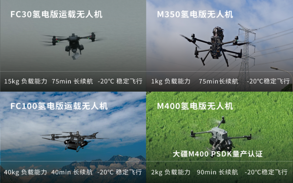 氢航科技作为氢动力系统在工业无人机行业应用的领路者之一,在2024年4月首次获得大疆运载认可,达成FC30运载无人机的氢动力系统改装合作,迄今已陆续推出M350、M400、FC100等多款机型的氢电版改装产品,并在国网、南网等客户的各类长航时、复杂环境作业任务中承担重要角色。