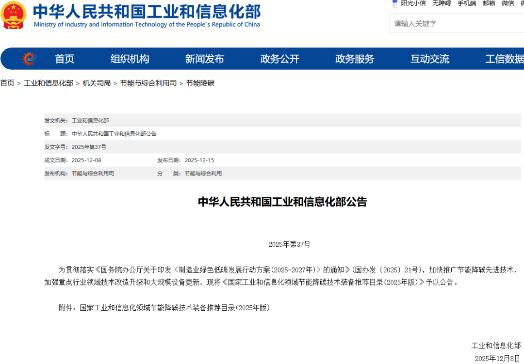 12月15日,中华人民共和国工业和信息化部公告 2025年第37号文发布,公布《国家工业和信息化领域节能降碳技术装备推荐目录(2025年版)》。