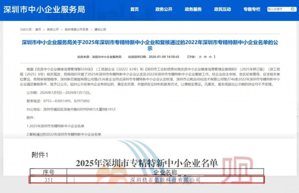 2026 年1月9 日,深圳市中小企业服务局正式公布2025 年深圳市专精特新中小企业名单,深圳稳石氢能科技有限公司(以下简称 “稳石氢能”)凭借在阴离子交换膜(AEM)电解水制氢领域的技术深耕与产业化突破成功入选。这一认证不仅是对稳石氢能 “专业化、精细化、特色化、新颖化” 发展特质的权威肯定,更标志着AEM绿氢技术获得政策层面的强力加持。