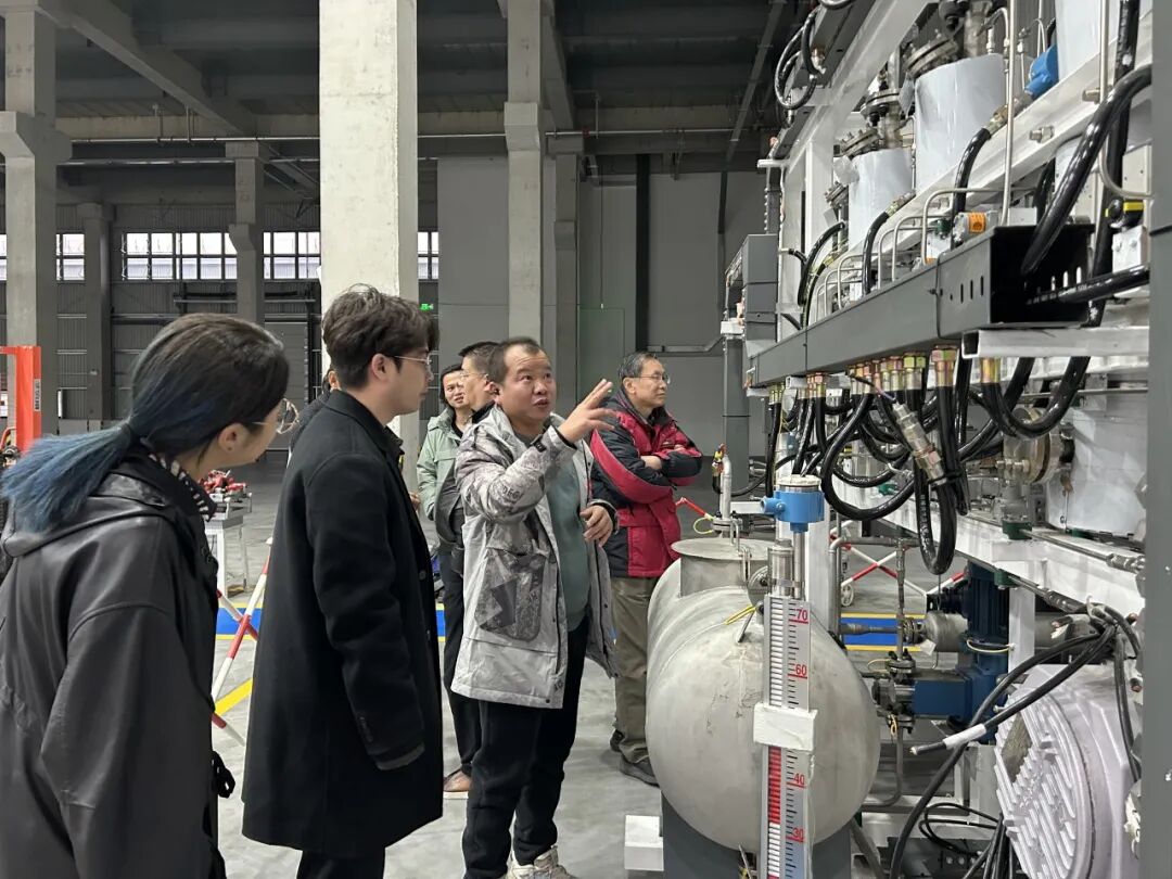 随后,江河绿氢团队参观了我司智能化生产车间,深入考察电解槽的制造工艺、质量控制体系及性能测试平台。考察过程中,双方围绕酶催化电极的规模化制备工艺、耐久性测试方案等具体技术细节进行了现场交流与探讨。