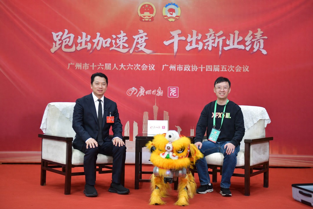 这么大的行李箱里,到底装着什么宝贝?在广州日报直播间,杨强向记者揭开了谜底——一只公司新研发的氢能机器狗。这只机器狗着实是个“萌宠”,头顶着舞狮的狮头,走路时眼睛眨巴眨巴,它可以像真狗一样坐着或趴着,还能伸出自己的“狗爪”,礼貌地和记者握手。