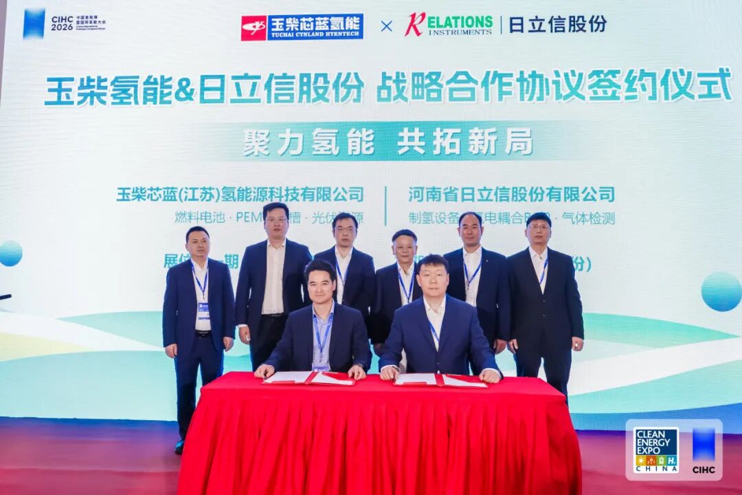 2026中国氢能展暨国际氢能大会期间,玉柴芯蓝(江苏)氢能源有限公司(以下简称“玉柴氢能”)与河南日立信股份有限公司(以下简称“河南日立信”)正式签署战略合作协议,将携手围绕氢能产业链关键环节展开深度合作,共同推动氢能技术创新、产品研发及市场应用,为我国氢能产业高质量发展注入新动能。玉柴氢能总经理卢国权与河南日立信总经理李博分别代表双方签署协议,玉柴氢能董事长钟玉伟、氢能行业专家及媒体代表共同见证了这一重要时刻。