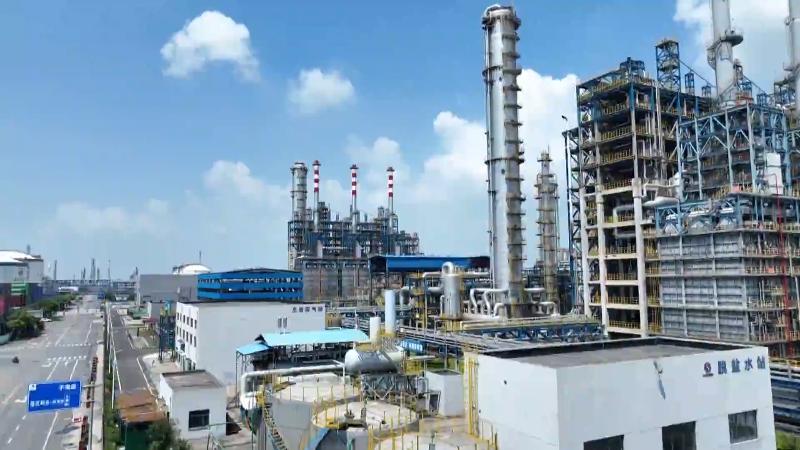 在蓝鲸生物实验室里,技术人员正在测试最新生物航空煤油样品,从废弃油脂中提炼,再经过加氢处理、分子裂解等一系列复杂工艺后,变为了高附加值的航空燃料。这里所需的氢气,全部通过管道从一街之隔的三江化工直接接入。