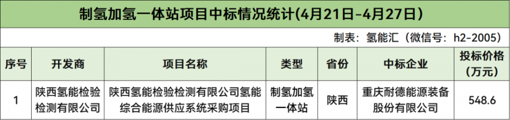 据氢能汇(微信号:h2-2005)统计,本周制氢加氢一体站中标项目共计1个,项目为陕西氢能检验检测有限公司氢能综合能源供应系统采购项目。
