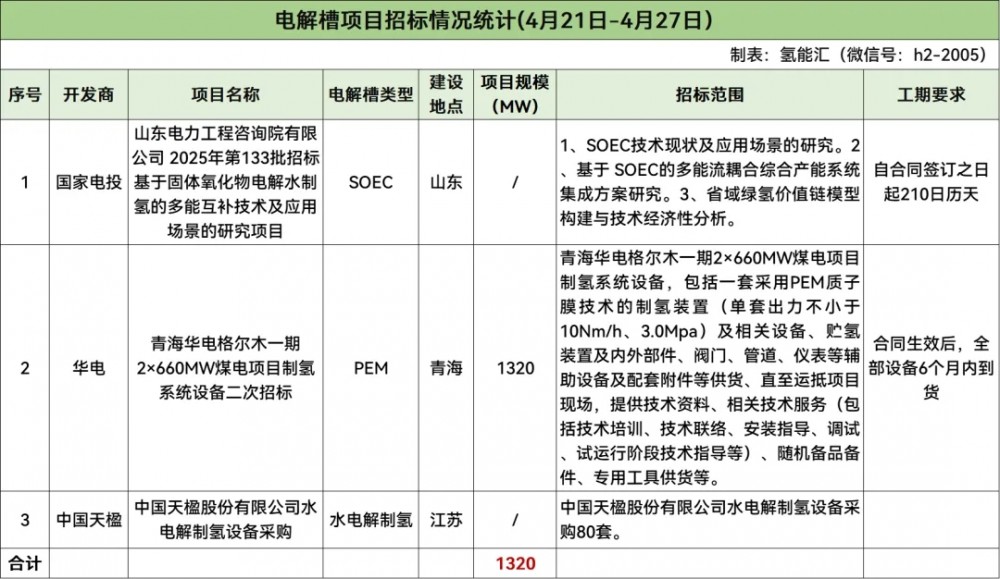据氢能汇(微信号:h2-2005)统计,本周电解槽设备招标市场方面,共3个项目启动采购,开发商是国家电投、华电、中国天楹。