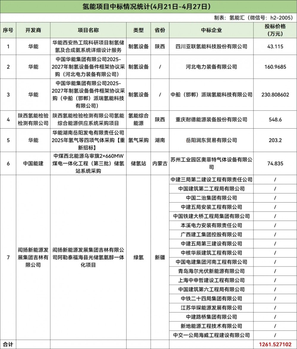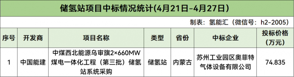 据氢能汇(微信号:h2-2005)统计,4月21日-4月27日氢能项目中标方面,制氢设备、制氢加氢一体站、氢气采购、储氢站、绿氢项目累计中标项目有7个,投标总报价为1261.527102万元,招标项目累计有11个。