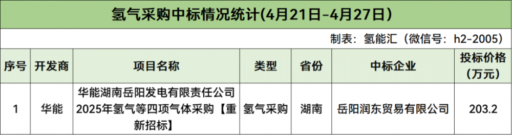 氢气采购开发商有1家,为华能,中标企业为岳阳润东贸易有限公司。