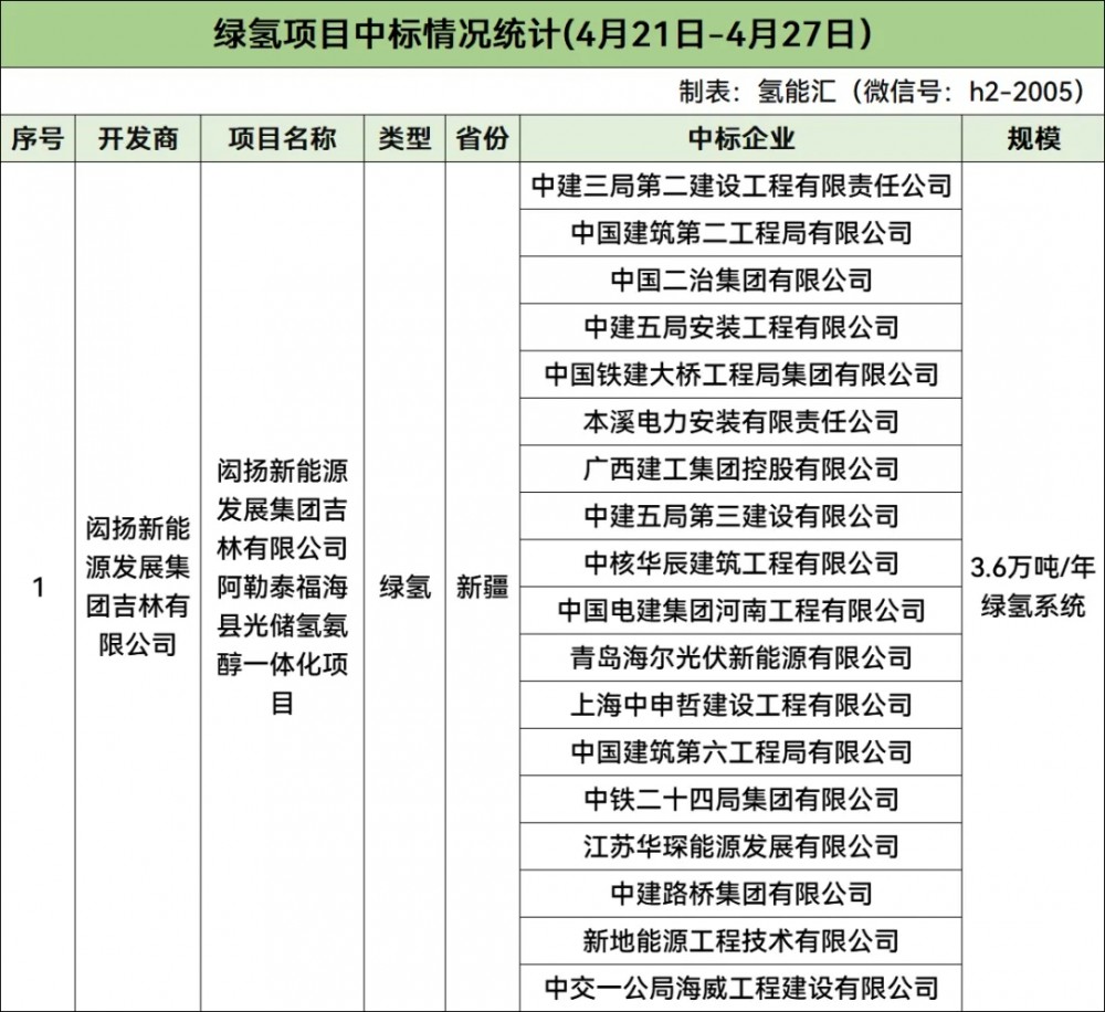 绿氢项目方面,开发商有1家,为闳扬新能源发展集团吉林有限公司,中标企业有18家。