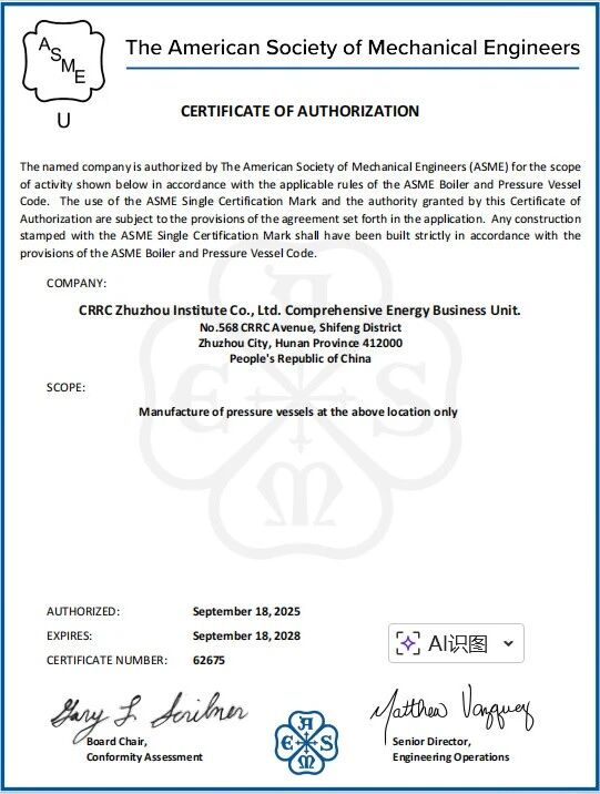 近日,中国中车集团旗下中车株洲所核心制氢设备获得ASME(美国机械工程师协会)和CE-PED(欧盟压力设备指令)两项国际认证,两项认证均由国际第三方权威检测、认证机构必维集团颁发。