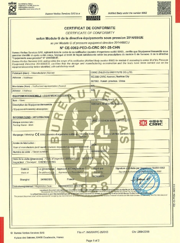 此次认证获取标志着中国中车在大规模制氢电解槽领域的技术进步,为后续服务全球氢能市场奠定基础。